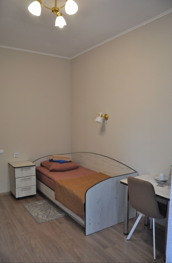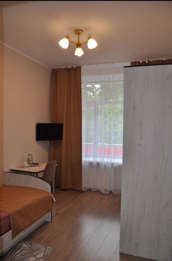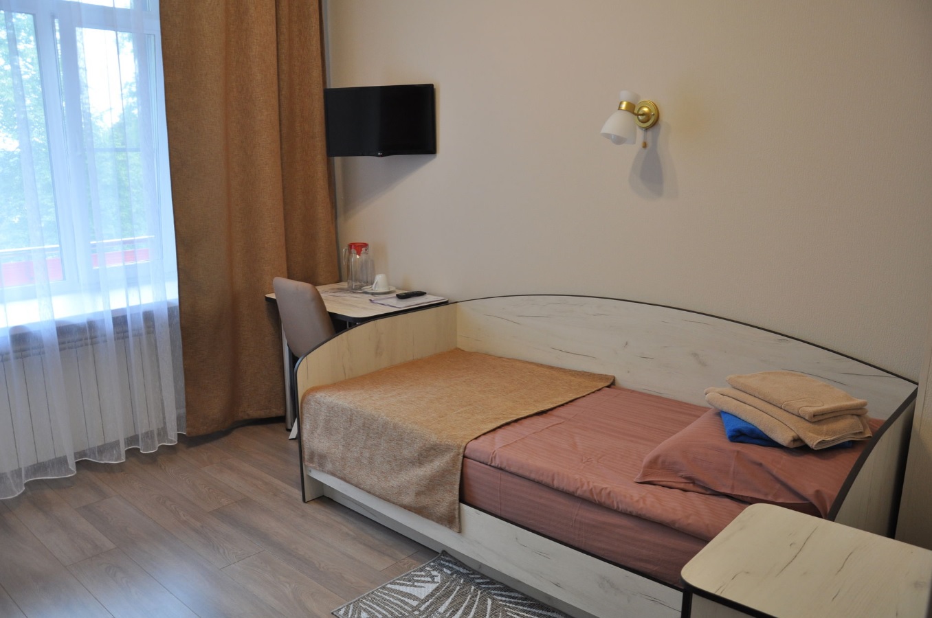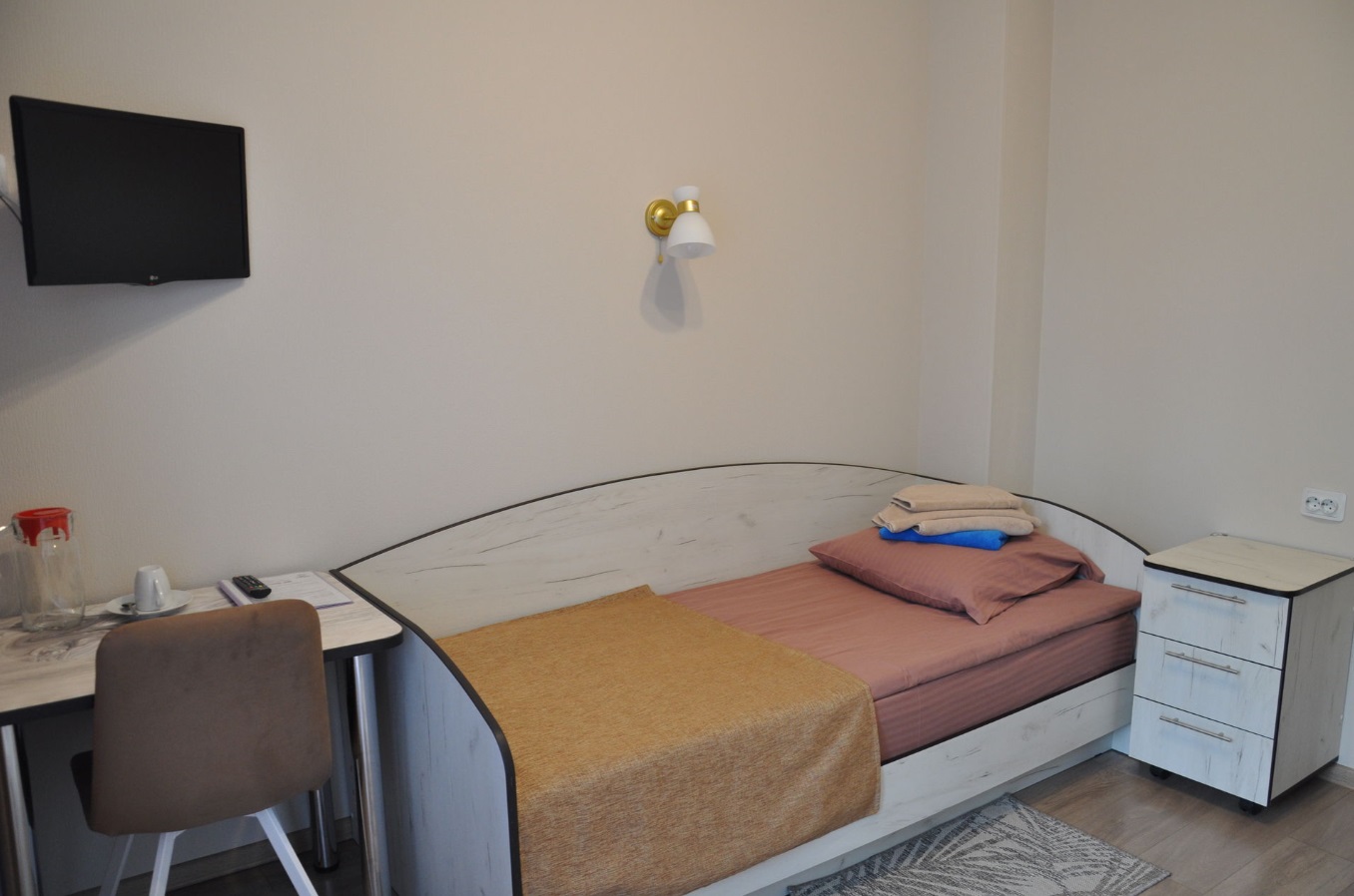 Оснащение номера: кровать односпальная, прикроватная тумбочка, стол, стул, шкаф, телевизор, холодильник