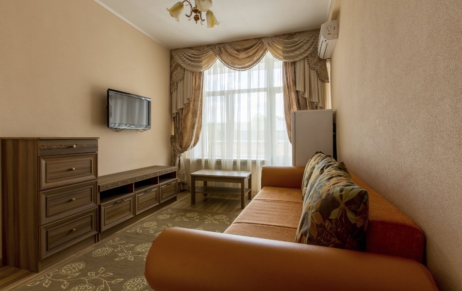 Оснащение номера: вешалка, диван, зеркало, кровать двуспальная, прикроватные тумбочки, столик журнальный, стул, шкаф, кондиционер, телевизор, холодильник, чайный набор посуды, электрочайник