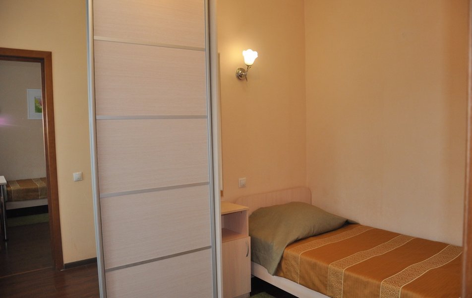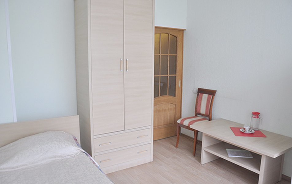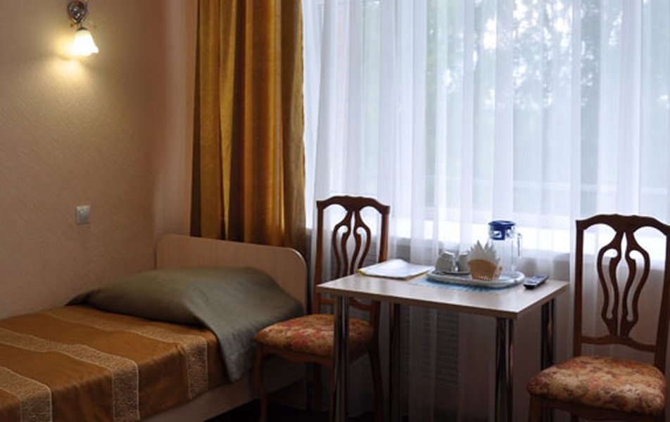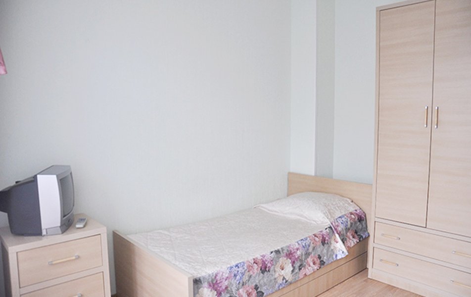 Оснащение номера: кровать односпальная, прикроватная тумбочка, стол, стул, шкаф, телевизор, холодильник