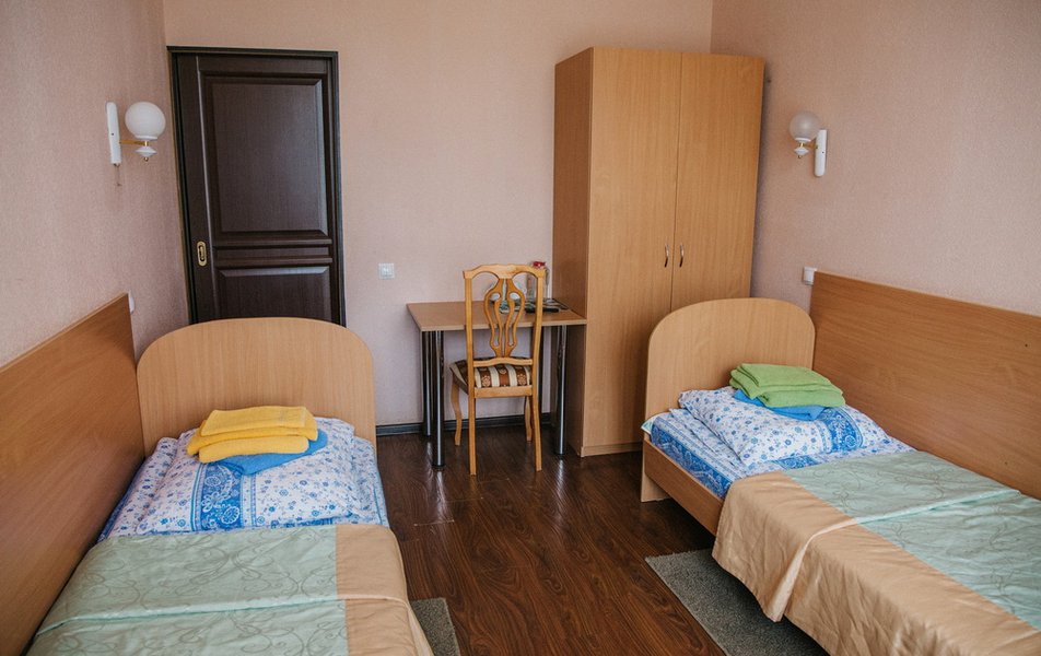 Оснащение номера: кровати односпальные, прикроватные тумбочки, кресло-кровать, стол, стулья, шкаф, телевизор, холодильник, чайный набор посуды, электрочайник