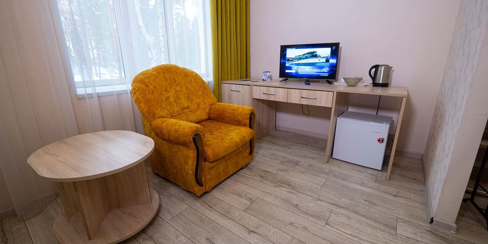 Оснащение номера: 2 кровати 1,5-спальные / в семейном номере одна 2,0-спальная, шкаф / вешалка для верхней одежды, стул 2 шт., холодильник, стол, телевизор, WIFI в холле на 1 этаже