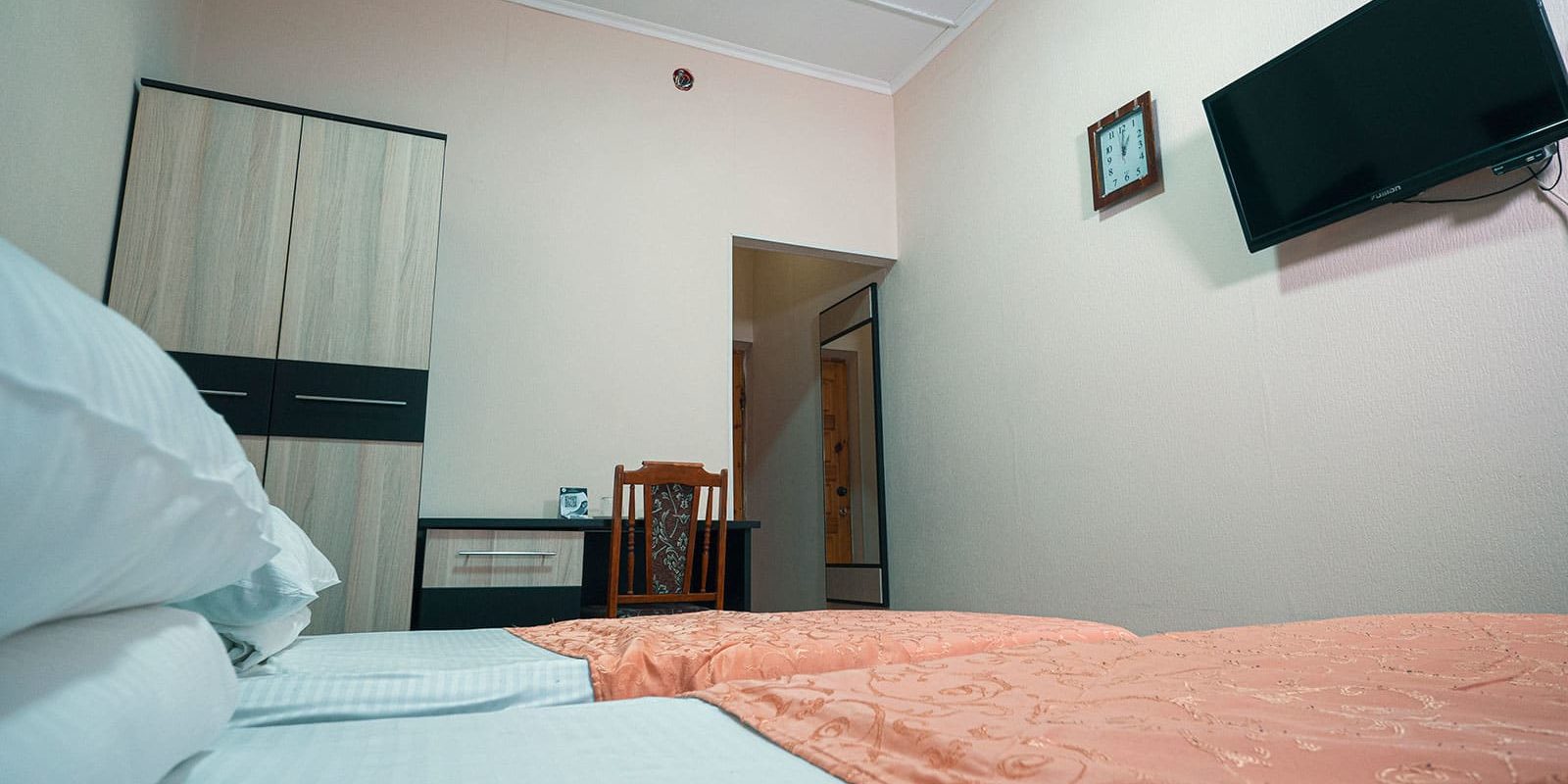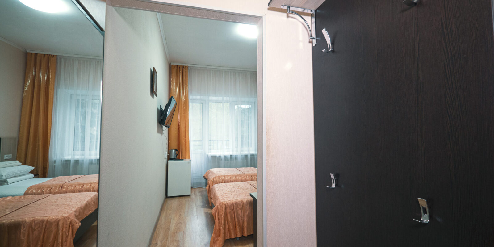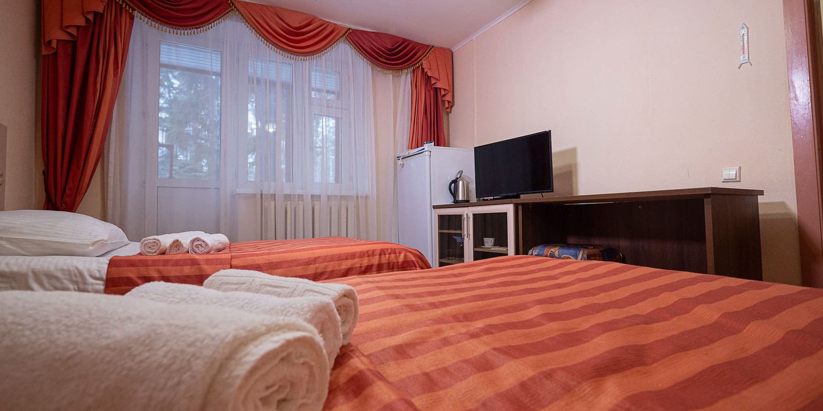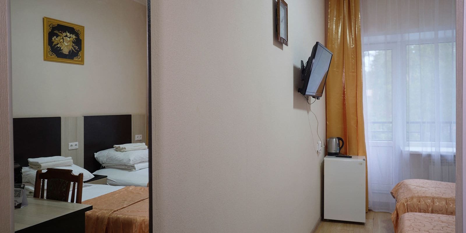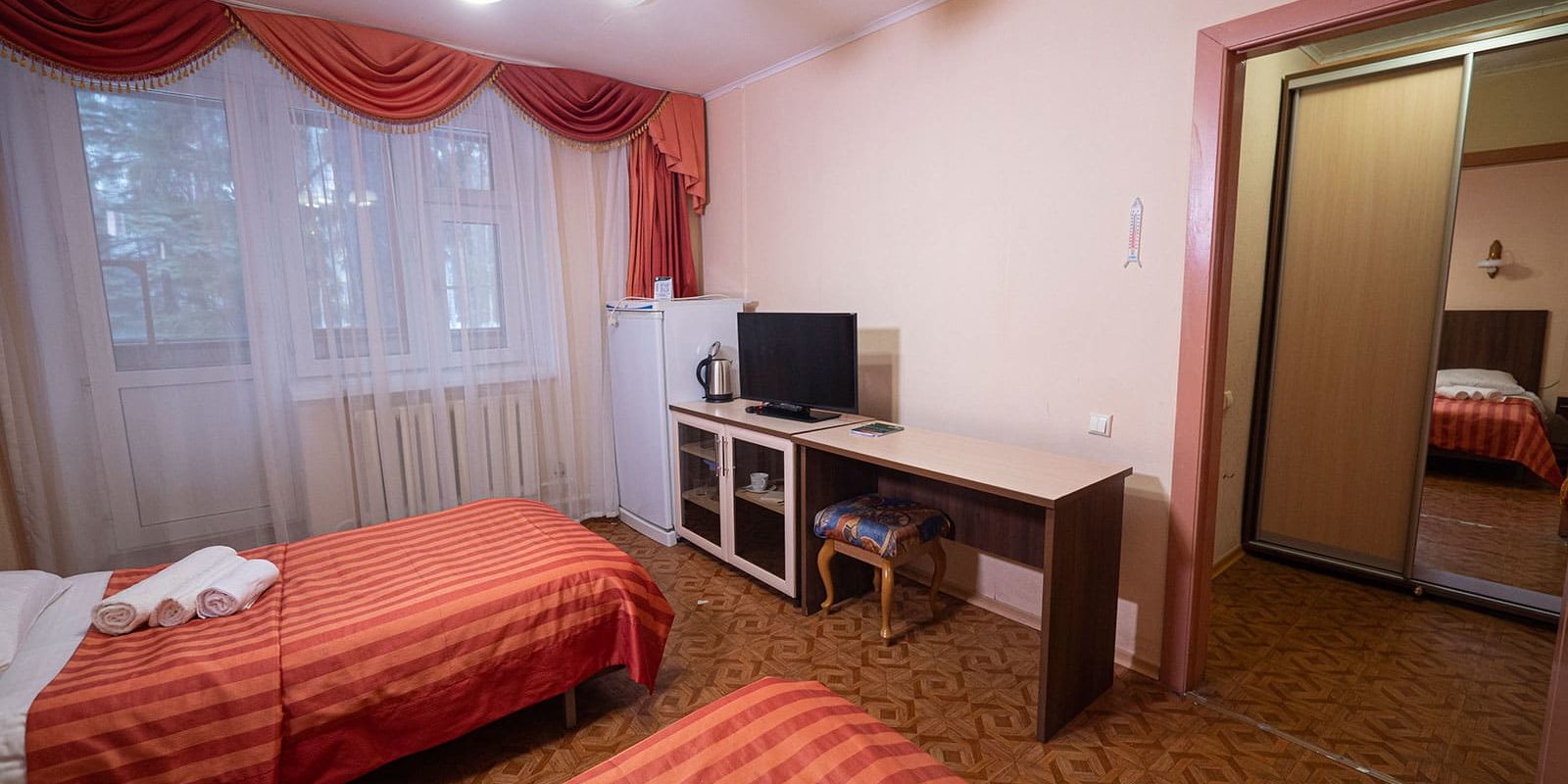 Оснащение номера: две односпальные кровати, стенка-горка под телевизор, прикроватная тумбочка (столик), шкаф/вешалка для верхней одежды, плазменный телевизор, холодильник