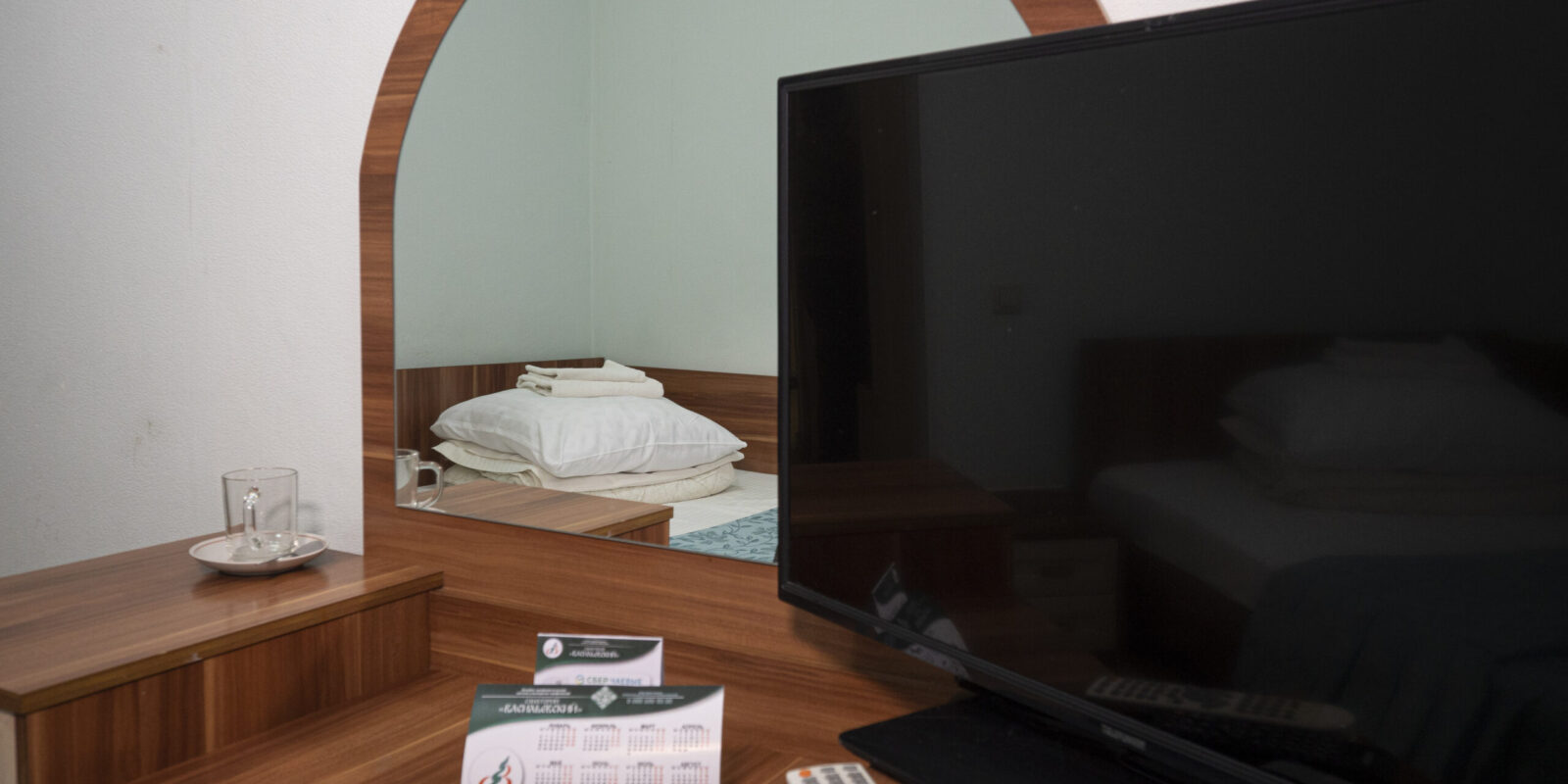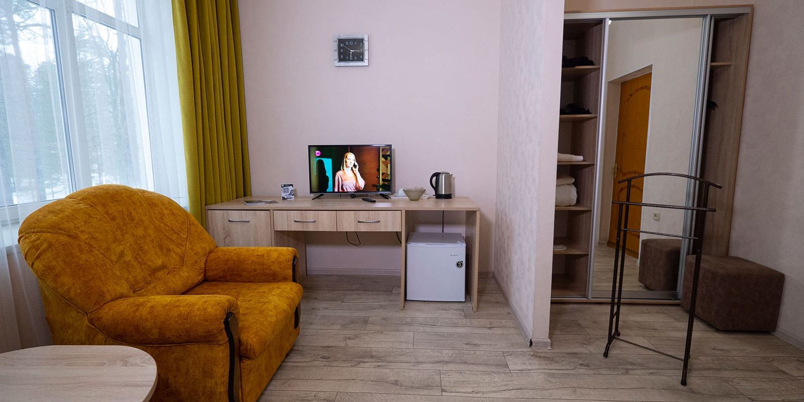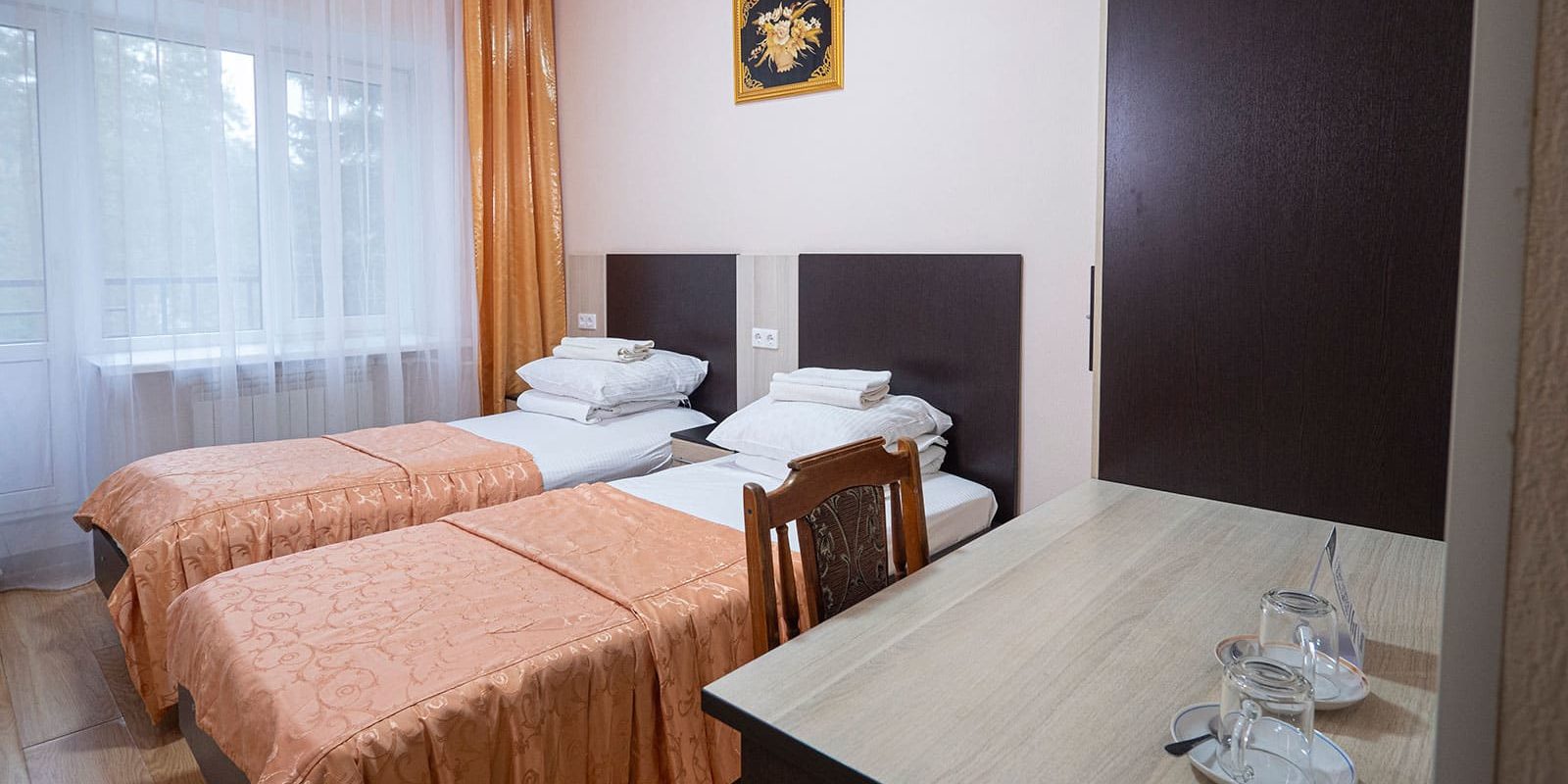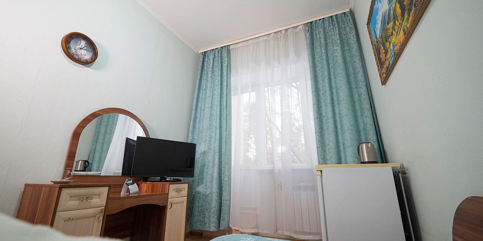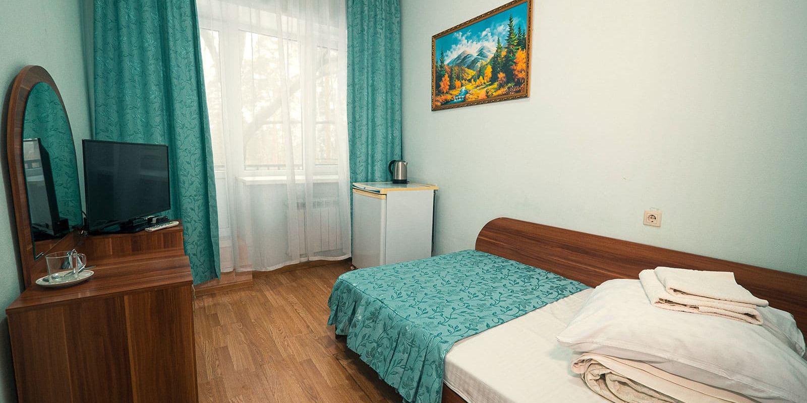 Оснащение номера: две односпальные кровати, стенка-горка под телевизор, прикроватная тумбочка (столик), шкаф/вешалка для верхней одежды, плазменный телевизор, холодильник