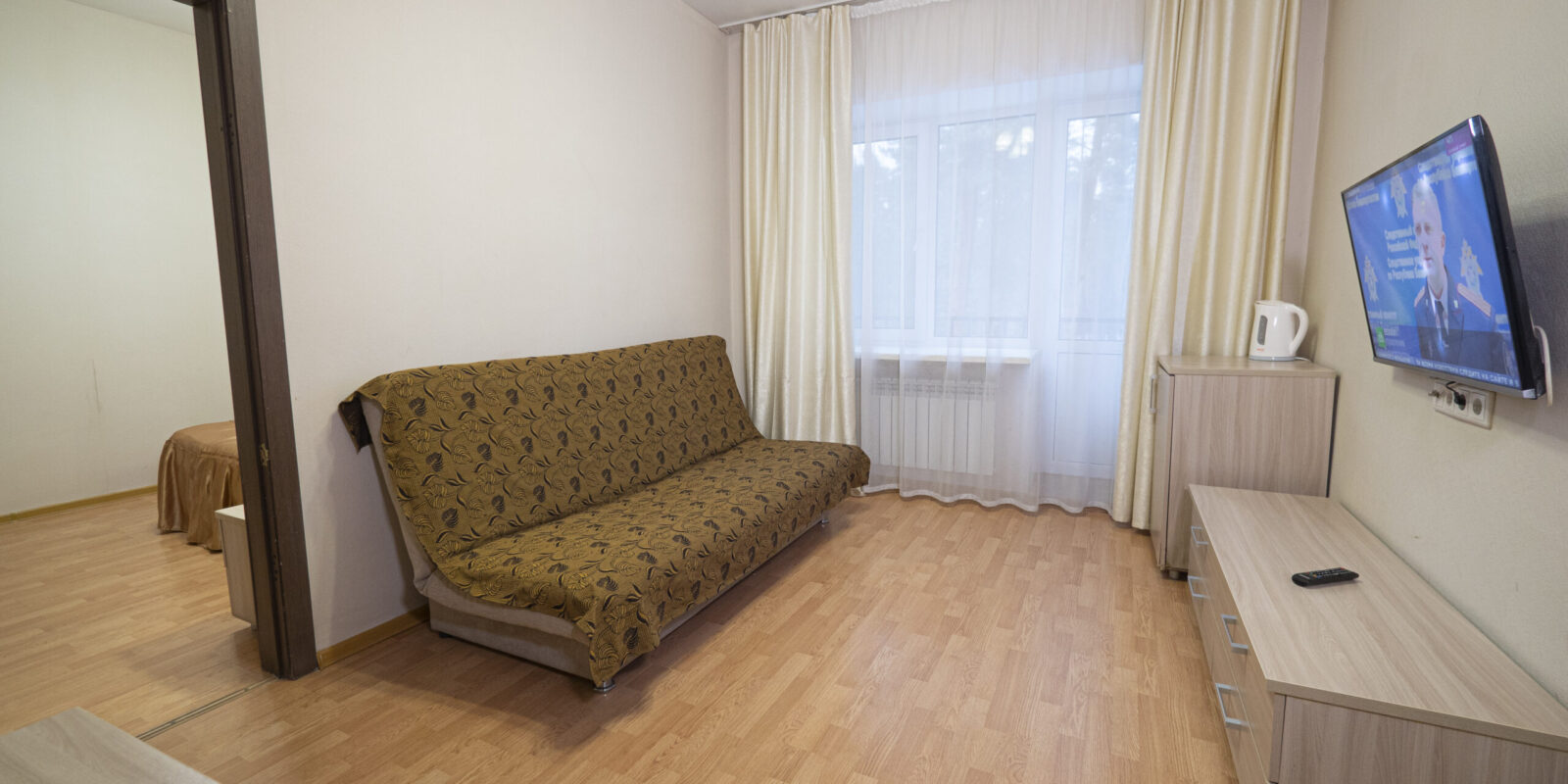 Оснащение номера: 2,0-спальная кровать + диван, стенка-горка под телевизор, прикроватная тумбочка (столик), шкаф/ вешалка для верхней одежды, плазменный телевизор, холодильник, WIFI в холле