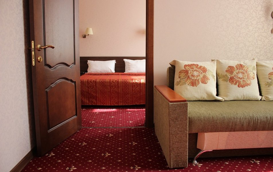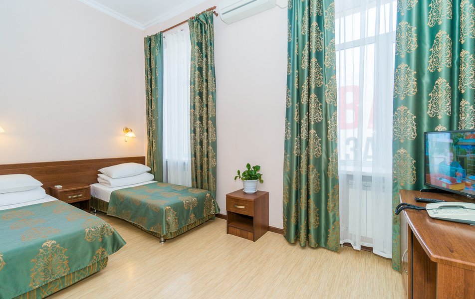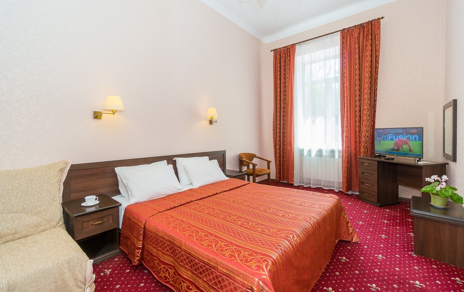 Оснащение номера: вешалка, зеркало, кресло-кровать, кровати односпальные или двуспальная кровать, обувная полка, прикроватные тумбочки, стол, стулья, шкаф, мини-холодильник, сплит-система, телевизор