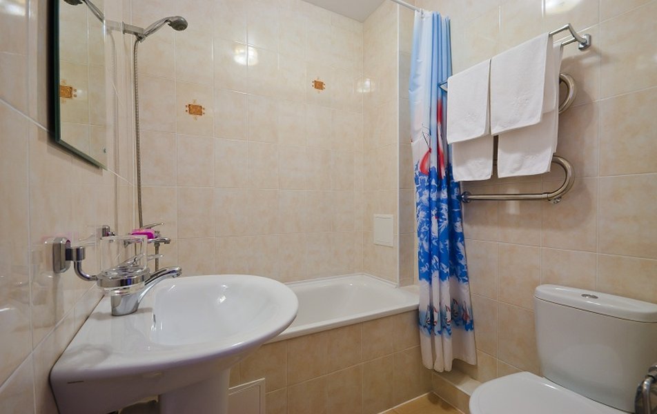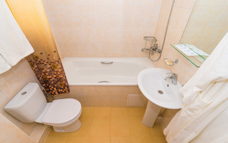 Санузел: ванна, раковина, унитаз, туалетные принадлежности: при заселении, фен, халат