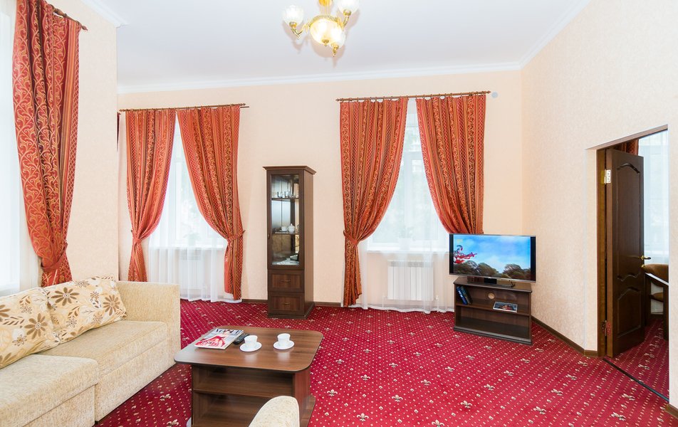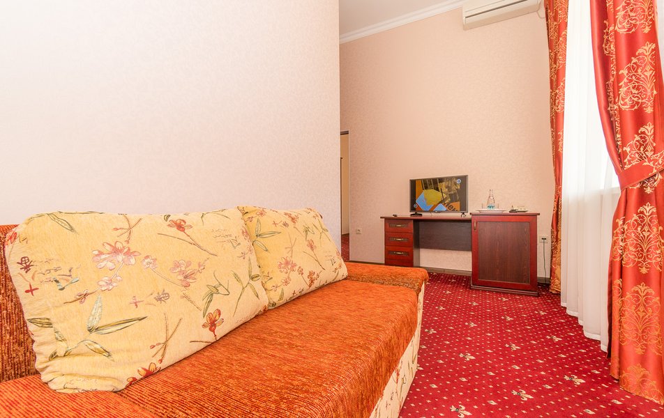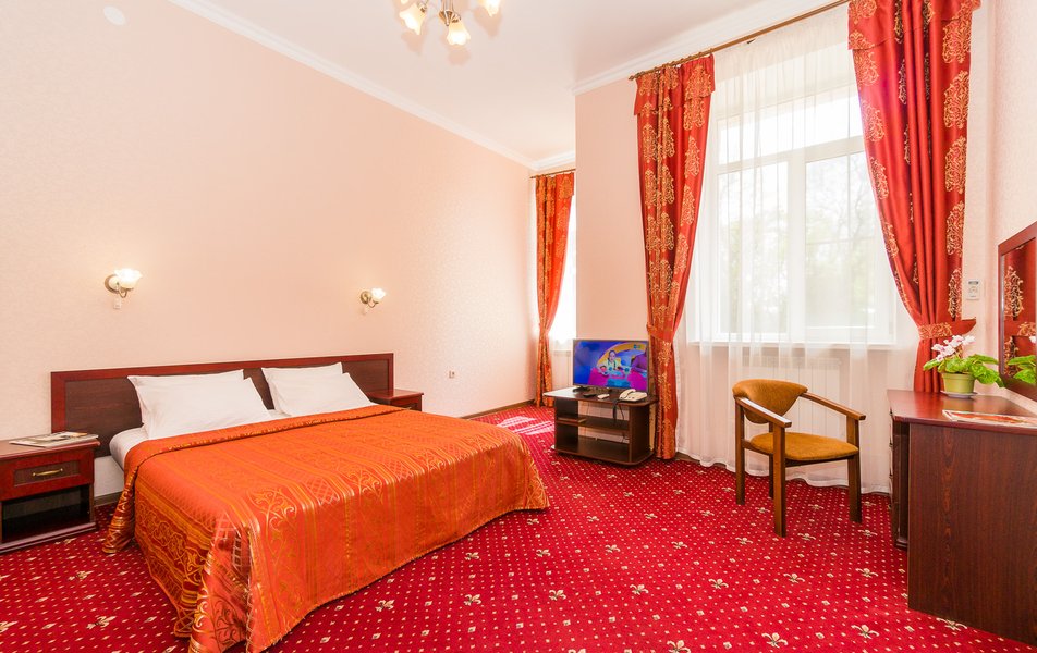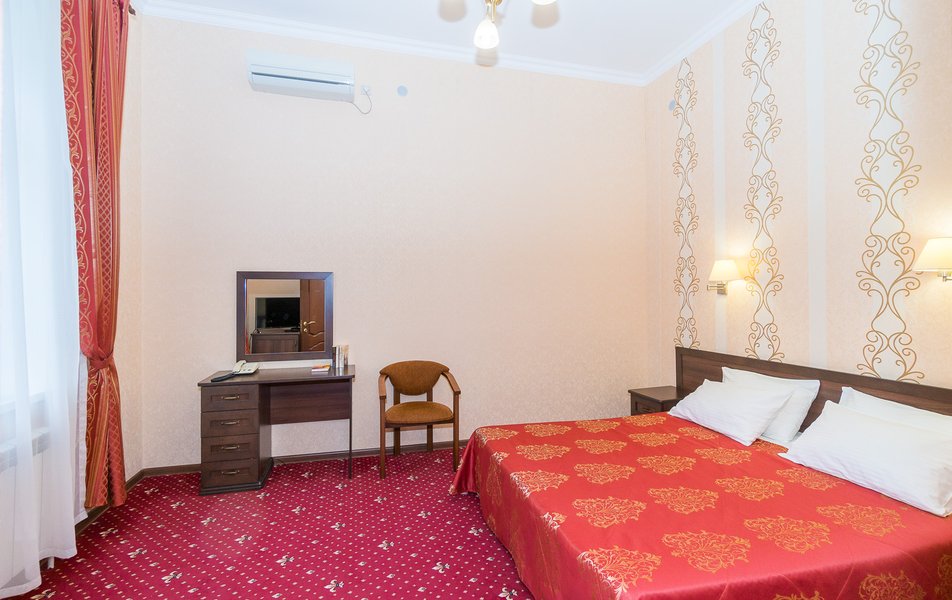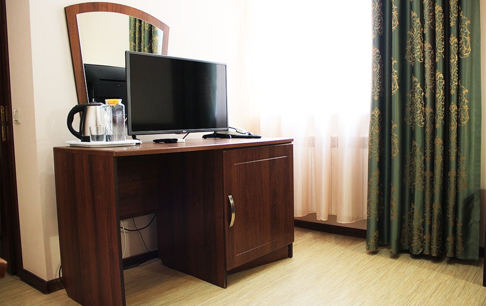 Оснащение номера: вешалка, зеркало, кровати односпальные или двуспальная кровать, прикроватные тумбочки, стол, стулья, шкаф, мини-холодильник, сплит-система, телевизор