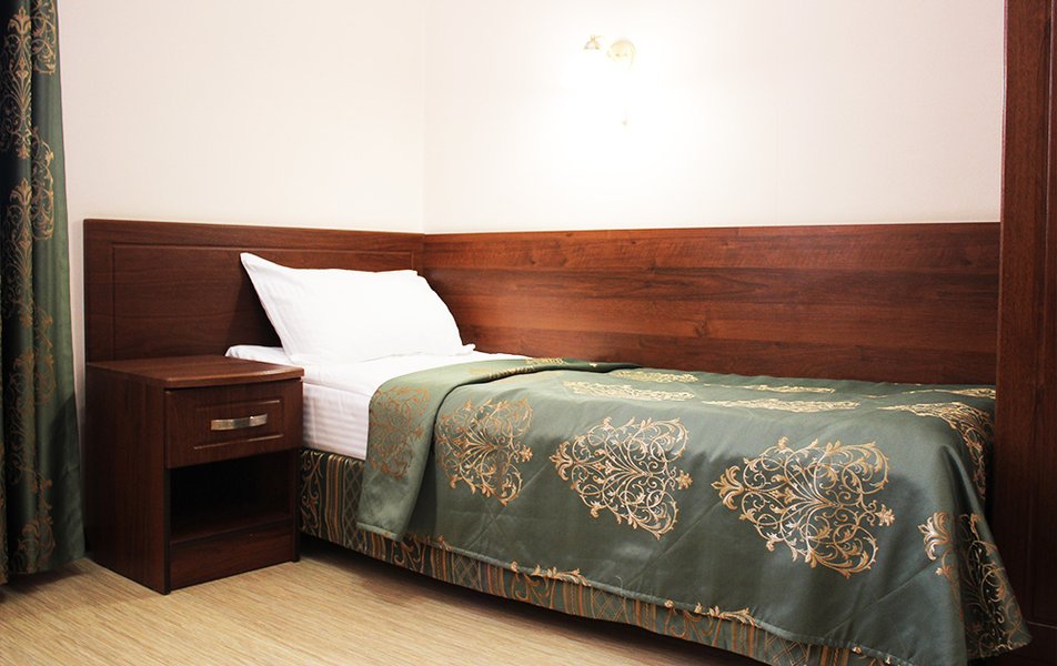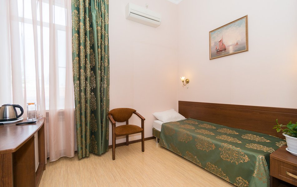 Оснащение номера: вешалка, зеркало, односпальная кровать, обувная полка, прикроватная тумбочка, стол, стул, шкаф, мини-холодильник, сплит-система, телевизор