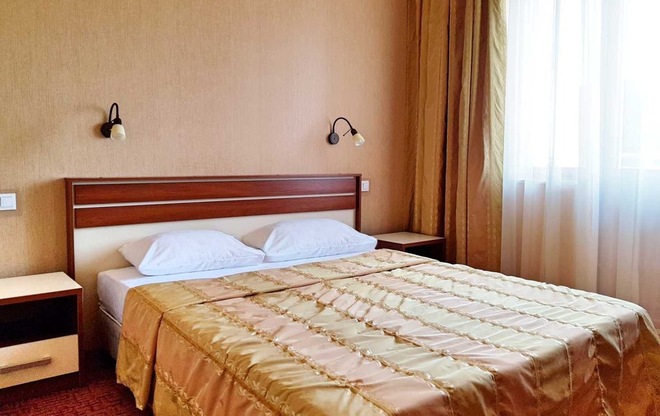 Оснащение номера: две односпальные кровати, прикроватные тумбы, шкаф, кресло-кровать, стол, стулья, мини холодильник, телевизор, телефон, климат-контроль, электронный сейф