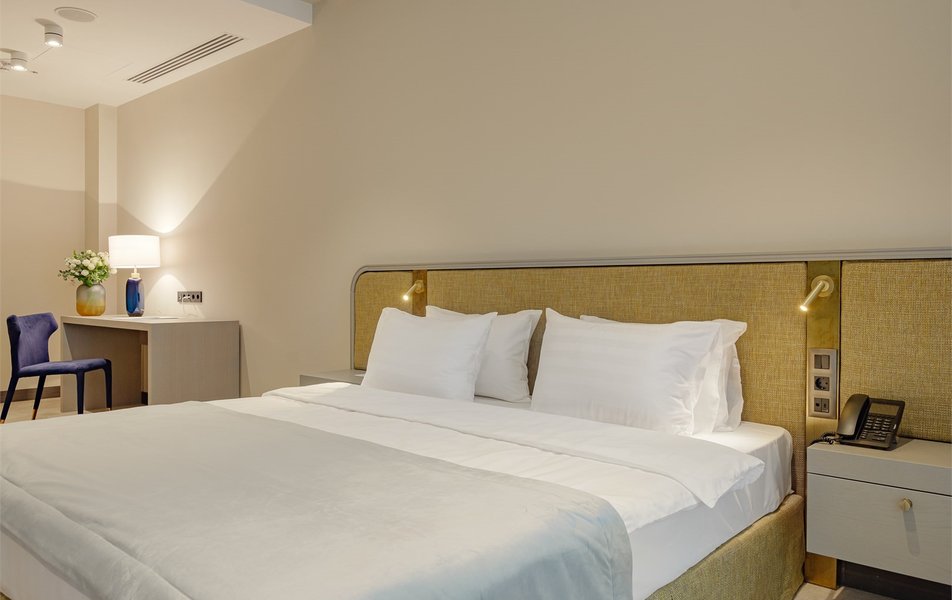 В номере: вешалка, гардеробная, диван, зеркало, комод, кресло, кровать двуспальная, прикроватные тумбочки, стол, столик журнальный, стул, кондиционер: фанкойл, мини-холодильник, телевизор, телефон